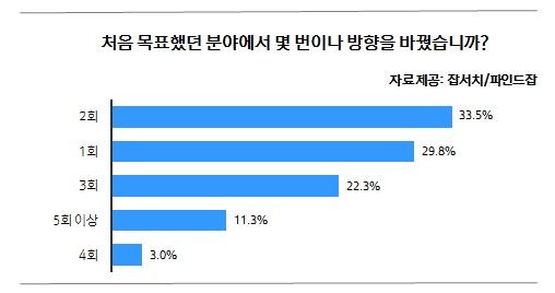 방향을 바꾼 횟수는 ‘2회’가 33.5%로 가장 많은 가운데, ‘1회’(29.8%), ‘3회’(22.3%) 순으로 이어졌고, ‘5회 이상’ 변경했다는 응답자도 11.3%에 이르렀다.
