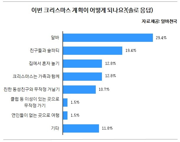 23일 아르바이트 전문 포털 알바천국이 전국 남녀 대학생 612명을 대상으로 진행한 ‘크리스마스 계획’ 설문조사에 따르면 솔로 응답자들의 계획 1위는 29.4%의 응답률을 차지한 ‘알바’였다.