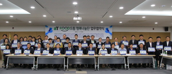 한국농수산식품유통공사( 사장 김재수)는 농식품유통교육원 교육수료 기업 및 복지단체 와 연계하여 지난 5월 11일 오후 aT센터에서 사회공헌 프로그램인‘aT FOOD드림 행복나눔’을 발족하고 지속적으로 지역 상생에 이바지하기 위한 업무 협약식을 개최한다.