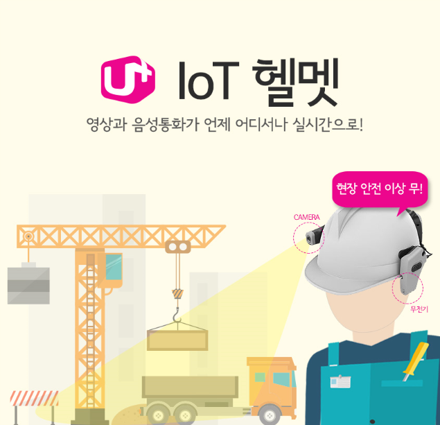 산업 현장에서 착용하는 안전모에 손쉽게 부착할 수 있는 ‘IoT 헬멧’은 LTE 모뎀, 카메라, 무전 기능, GPS 등을 탑재해 실시간으로 산업 현장을 모니터링하고 근로자의 위치 및 동선 등을 확인 할 수 있을 뿐 아니라, 관제 센터와 근로자 간 커뮤니케이션 효율도 높일 수 있다.