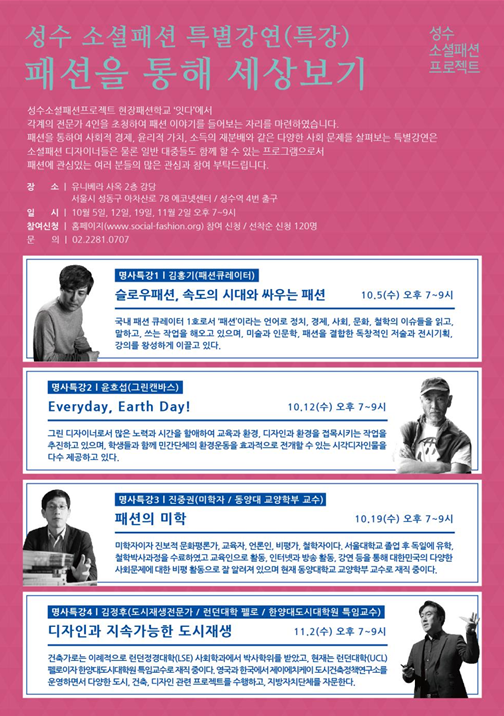 강연 참여 신청 및 관련 행사에 대한 자세한 사항은 성수 소셜패션프로젝트 홈페이지 또는 소셜패션프로젝트 사무국으로 문의하면 된다. 강연은 선착순 120명 마감이다.