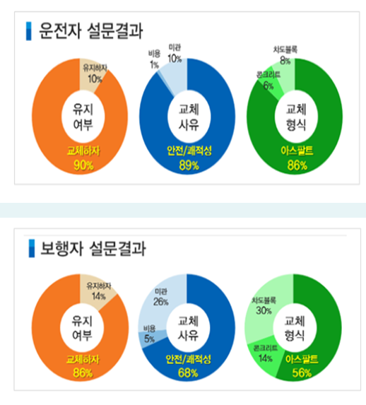 노선버스 및 택시 운전자와 보행자 모두 교체가 필요하다는 의견이 압도적이었으며, 특히 운전자들은 주행성, 평탄성, 안전성 등의 이유로 조속한 아스팔트 포장 교체를 요구했다.