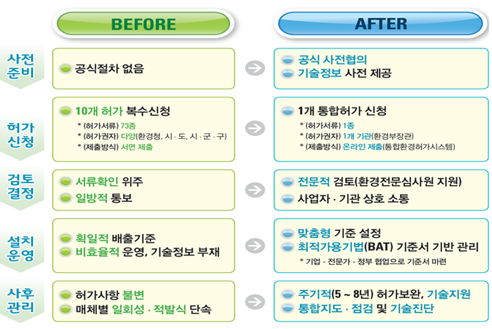 통합환경관리제도는 기존의 수질, 대기 등 환경매체별로 분산된 환경 인·허가를 하나로 통합하고 과학·기술에 기반한 선진화된 사업장 환경관리 방식이다.