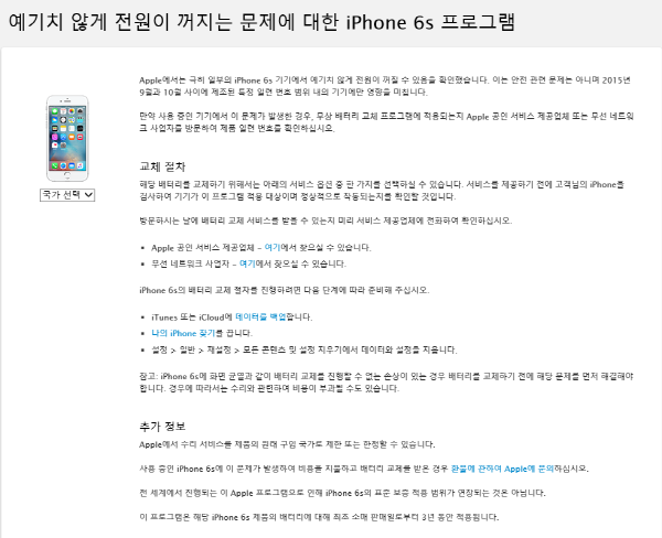업계에 따르면 애플은 지난 21일부터 공인 A/S 센터를 통해 갑자기 전원이 꺼지는 아이폰6s 제품의 배터리를 무료로 교체해주고 있다. 하지만 일선 매장이나 센터에는 배터리가 부족해 교체 작업에 차질을 빚는 것으로 알려졌다.