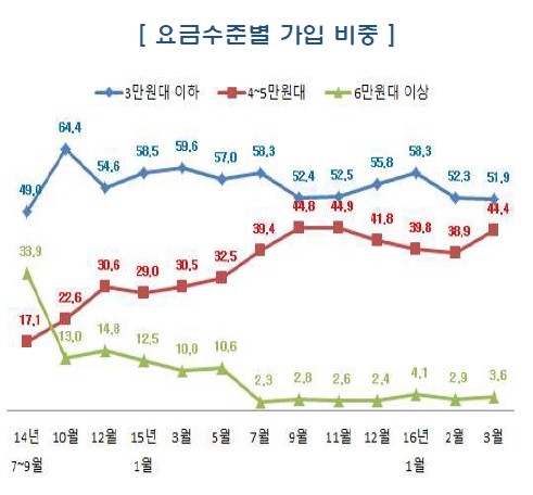 요금제 가입비중도 6만원 이상 고가요금제의가입비중이 34%에서 3.6%로 급격히 감소했으며 평균 R입요금도 4.5만원에서 4만원을, 개통시 부가서비스 가입율도 38%에서 5.1%로 낮아졌다.