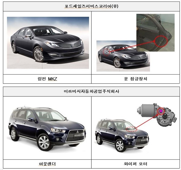 미쓰비시자동차공업에서 수입해 판매한 미쓰비시 아웃랜더 606대는 앞유리 와이퍼 모터 통기구로 물이 유입돼 와이퍼 모터가 부식될 수 있다. 부식으로 인해 와이퍼 모터가 작동하지 않을 경우 운전자의 시야확보가 되지 않아 안전 운행에 지장을 줄 수 있다.