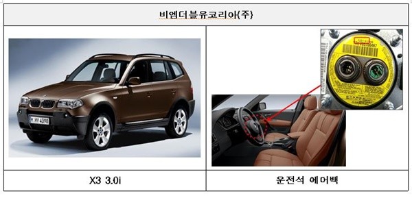 BMW코리아에서 수입해 판매한 BMW X3 3.0i 등 2개 차종 38대는 운전석 에어백이 차량 수리 시 결함이 있는 에어백(일본 다카다)으로 교체됐을 가능성이 있다. 결함이 있는 에어백으로 교체됐을 경우 에어백 작동 시 과도한 폭발압력으로 금속파편이 탑승자를 다치게 할 수 있다.