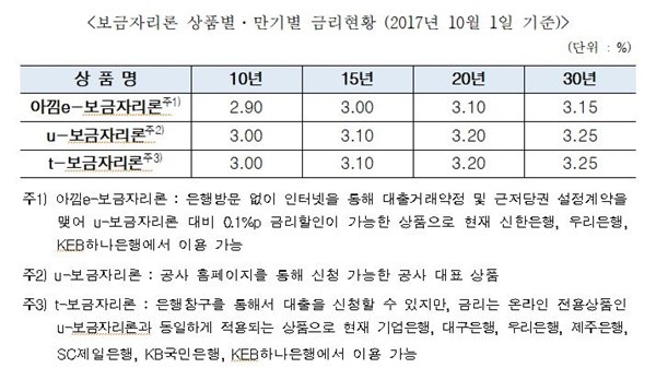 이에 따라 공사 홈페이지를 통해 신청하는 ‘u-보금자리론’과 은행 창구에서 신청하는 ‘t-보금자리론’은 연 3.00%(10년)∼3.25%(30년) 금리가 적용된다. 전자등기 등을 통해 비용이 절감되는 ‘아낌e-보금자리론’은 연 2.90%(10년)∼3.15%(30년) 금리가 적용된다.