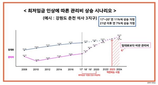 국회 국토교통위원회 소속 김현아 의원이 임대아파트를 관리하는 주택관리공단으로부터 받은 국정감사 자료를 분석한 결과 내년 최저임금이 16.4% 인상되면 전국의 임대아파트 관리비가 최대 14.9%까지 급등하는 것으로 나타났다.