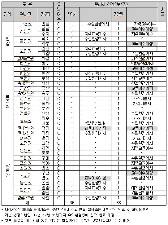 유해화학물질 관리자 선임대상 정수장 및 선임 현황에 따르면 수자원공사는 권역별로 총 36개소 사업장을 운영관리하고 있다.