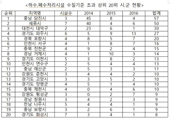세종시 전의면에 위치한 산업단지 폐수처리장은 세종시에 단속권이 있는데도 3년 동안 방류수 수질기준을 41건이나 위반했다. 충남 당진시 원당동에 위치한 하수처리장은 당진시가 운영하는 시설임에도 39건을 초과하는 등 지자체의 도덕적 해이가 심각했다.