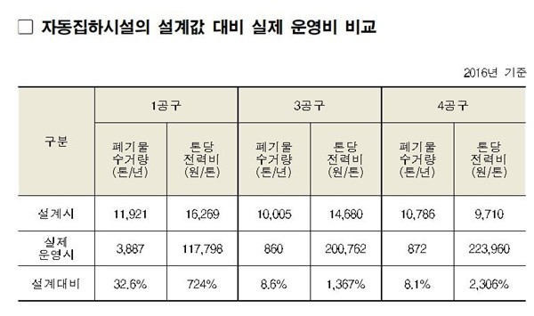 특히, 쓰레기 자동집하시설은 계획대비 낮은 가동률에도 전력소모는 천정부지처럼 높았다. 4공구의 경우 당초 1톤당 9710원으로 설계됐지만 실제로는 1톤당 설계대비 23배를 넘어선 22만3960원이 드는 것으로 집계됐다.