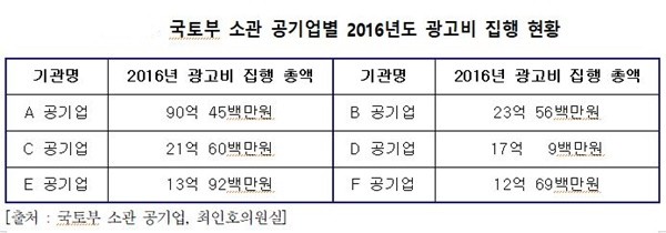 국회 국토교통위원회 소속 최인호 의원(더불어민주당, 부산사하갑)이 국토부 소관 공기업의 ‘2016년 방송·인쇄 광고비 집행내역’ 조사 결과에 따르면 연간 최대 광고비를 지출한 곳은 90억원이 넘었고 대부분 연간 10억 이상을 광고비로 집행했다.