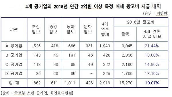 최 의원실의 조사 결과 보수 성향의 4개 특정 언론사에 연간 2억 이상 광고비를 지급한 공기업이 4군데로 나타났다. 4개 공기업 전체 광고비 153억원 중 4개 언론사가 29억원(19.07%)을 지급받았고, 이중 동아일보는 10억원으로 1개 언론사가 무려 6.5%을 받은 것으로 확인됐다.