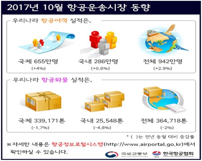 국토교통부(장관 김현미)는 2017년 10월 국제여객 및 국내여객이 전년 동월 대비 각각 4%, 0.6% 증가했고, 항공화물은 전년 동월 대비 -2% 감소했다고 발표했다.