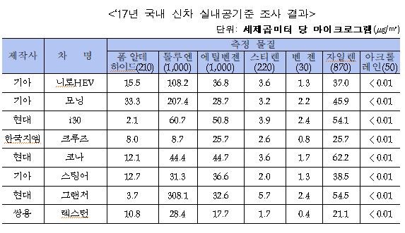 자동차안전연구원은 이들 차량으로 대상으로 폼 알데하이드, 톨루엔 등 7개 유해물질의 권고기준 충족 여부를 측정했다.