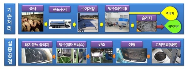 현장 시연에서는 탈수·건조·성형 등 공정과정을 거쳐 수분함량을 줄인 돼지분뇨를 고체연료로 생산해 향후 발전소 연료(혼합 대체연료)로 활용 가능한 돼지분뇨 고체연료화 실증기술을 선보일 예정이다.