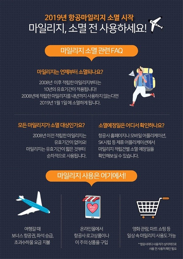 국토교통부는 2019년부터 시작되는 항공마일리지 소멸을 앞두고 소비자들의 마일리지 사용을 독려하기 위해 항공사와 함께 마일리지 소멸안내 및 사용처 확대 내용을 20일 발표했다.