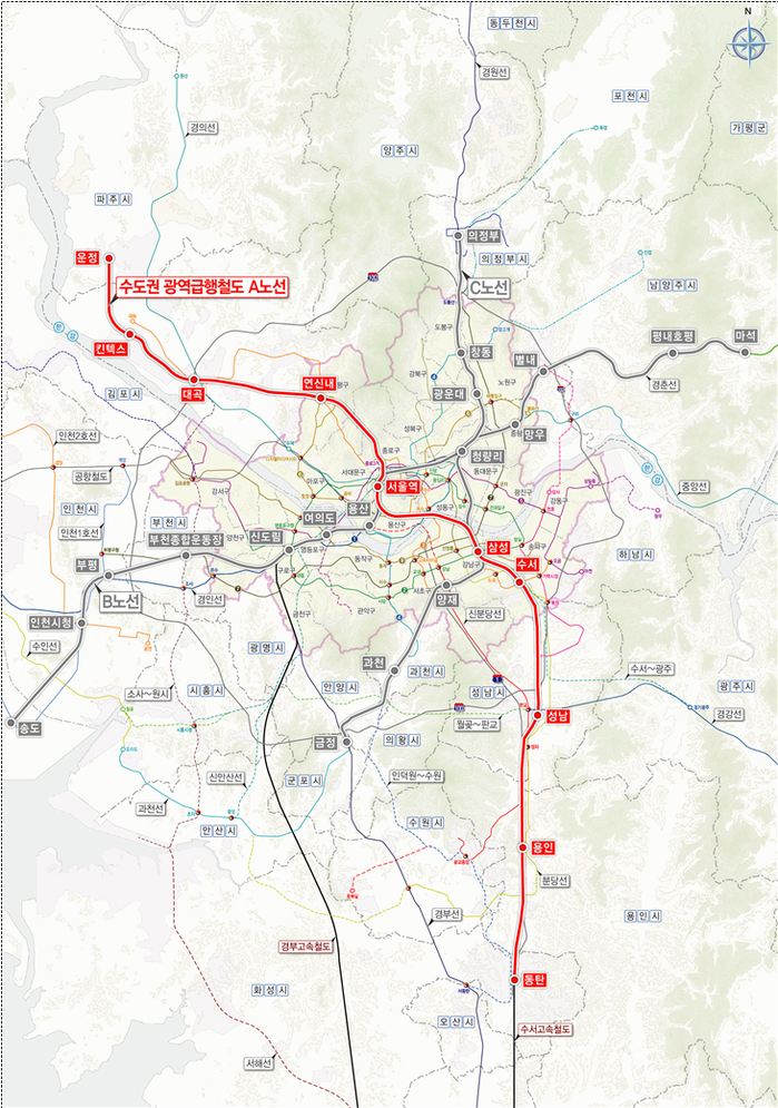 수도권 광역급행철도는 총 3개 노선(A노선 파주~동탄, B노선 송도~마석, C노선 의정부~금정, 총 211km)으로 계획됐다.