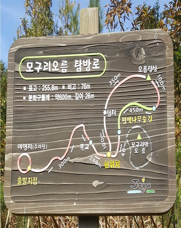모구리오름은 산체가 크지는 않지만 오름 내부에 작은 알오름이 있는 이중구조의 오름으로 능선을 돌아볼 수 있게 탐방로가 조성돼 있다. 정상에 오르면 일출봉과 함께 제주 동부지역의 조망을 한눈에 감상할 수 있다.