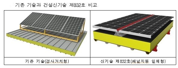 제832호로 지정된 ‘태양광발전 일체형 지붕 시공공법’은 태양광발전 설비를 지붕과 일체화해 시공함으로써 공사기간과 공사비를 대폭 줄인 공법이다.