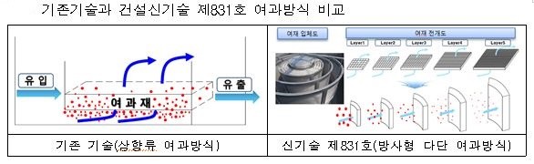 이번 신기술은 원통형의 여과 장치를 여러 겹으로 설치함으로써 여과성능을 10% 정도 향상시킬 뿐만 아니라 장치 설치에 필요한 부지를 5분의 2 수준으로 대폭 줄일 수 있어 공사비를 약 30% 절감할 수 있다.