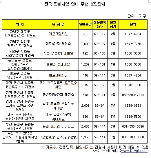 부동산 리서치회사 닥터아파트에 따르면 올해 전국 재개발·재건축 등 정비사업 일반분양 물량은 총 107개 단지 5만6373가구로 조사됐다.