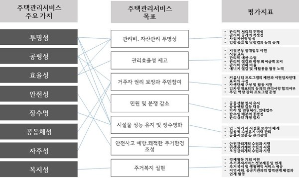 우선 주택관리 서비스 분야에대한 서비스품질 평가체계가 전격 도입된다. 서비스품질 평가체계란 서비스의 실행여부 또는 실제 서비스를 제공받는 입주민 만족도 측정에 중점을 두는 서비스경영 기법의 일종이다.