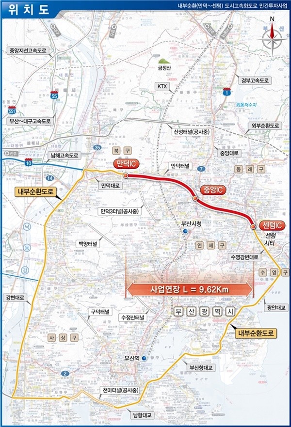 부산 북구 만덕동(만덕대로)~중앙로~해운대구 재송동(수영강변대로)을 연결하는 대심도지하터널로 연장 9.62km, 왕복4차로로 민간투자비 5885억원을 포함 총 7832억원의 사업비가 소요된다.