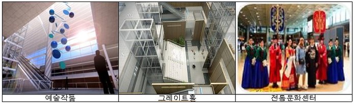 공항이라는 공간 특수성, 우리나라의 관문으로서 한국의 이미지를 형상화하는 다양한 예술작품을 공항 곳곳에 배치했다.