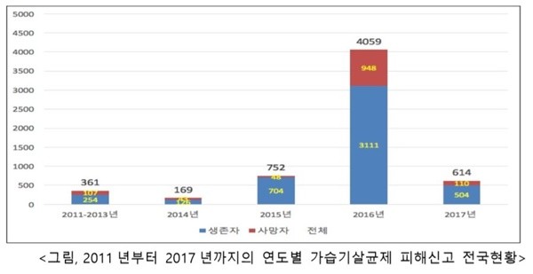 센터가 피해신고 접수창구인 한국환경산업기술원으로부터 국회 김삼화의원실에서 제공받은 자료를 분석한 결과, 가습기살균제 피해 신고는 사회문제로 떠오르던 2016년 4059명(사망 948명)으로 가장 많이 이뤄졌다.