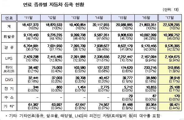 휘발유는 2011년 49.7%에서 2017년 46.0%, LPG는 2011년 13.2%에서 9.3%로 줄었다.