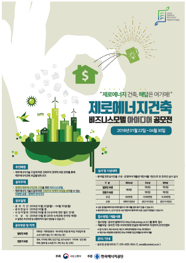 하지만 건축주의 추가 건설비 부담이 민간부문의 자발적인 참여를 저해하고 있어 금융을 포함한 다양한 정책적 아이디어를 통해 제로에너지건축 활성화를 촉진하고자 이번 공모전을 마련했다.