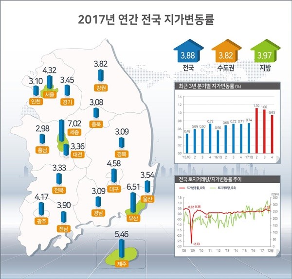 국토교통부가 31일 발표한 ‘2017년 연간 전국 지가변동률’에 따르면 지난해 전국 땅값은 평균 3.88% 상승해 전년 대비(2.70%) 1.18%p 증가했다.