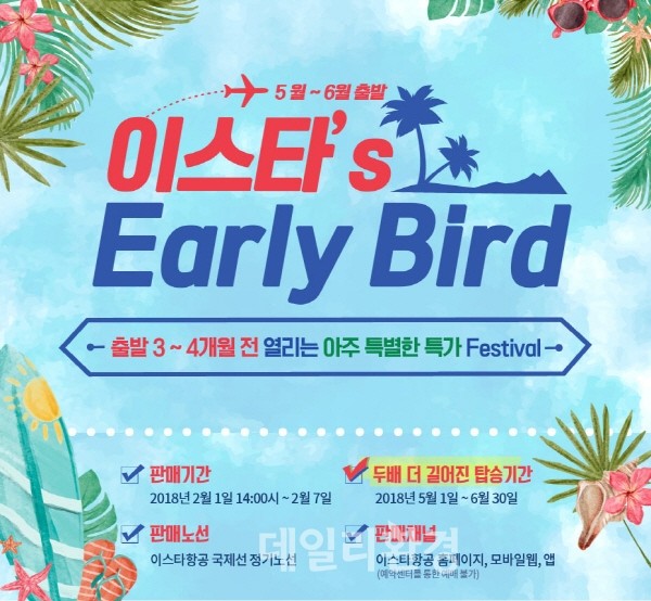 매달 1일부터 7일까지 일주일 간 출발 4개월 전 항공권을 미리 특별한 가격에 만날 수 있는 이스타항공의 얼리버드 이벤트가 새로워진다.