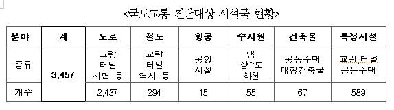 국토교통부는 5일부터 다음 달 30일까지 국민의 안전과 직결되는 국토교통 시설물 3457곳에 대한 ‘2018년 국가 안전대진단’에 나선다고 밝혔다.