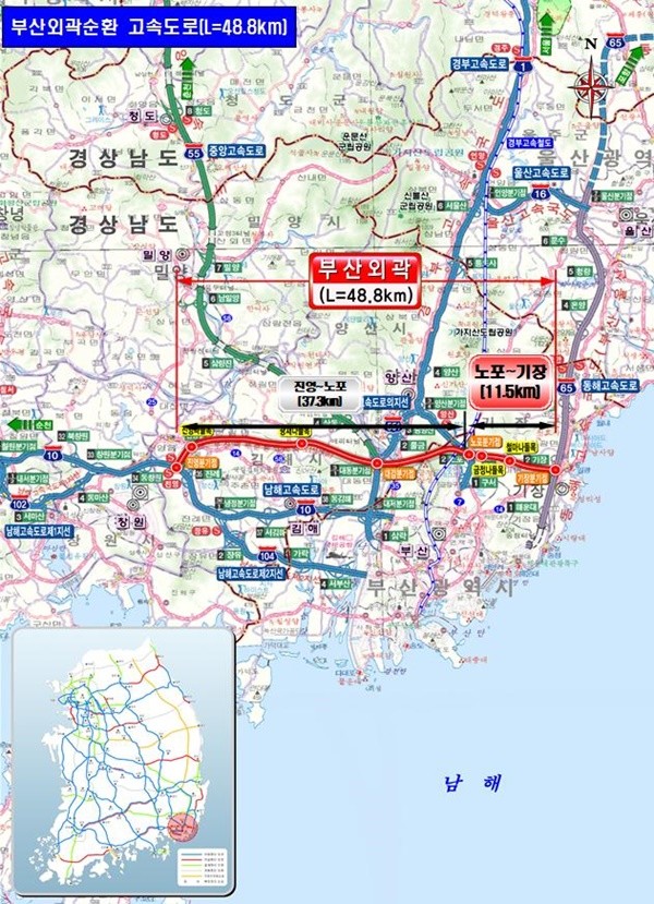 또 기존의 남해고속도로와 중앙고속도로, 경부고속도로, 동해고속도로(부산~울산선) 등 동남권 핵심 고속도로와 모두 이어져 전국 어디서나 편리하게 오갈 수 있는 교통축이 형성된다.