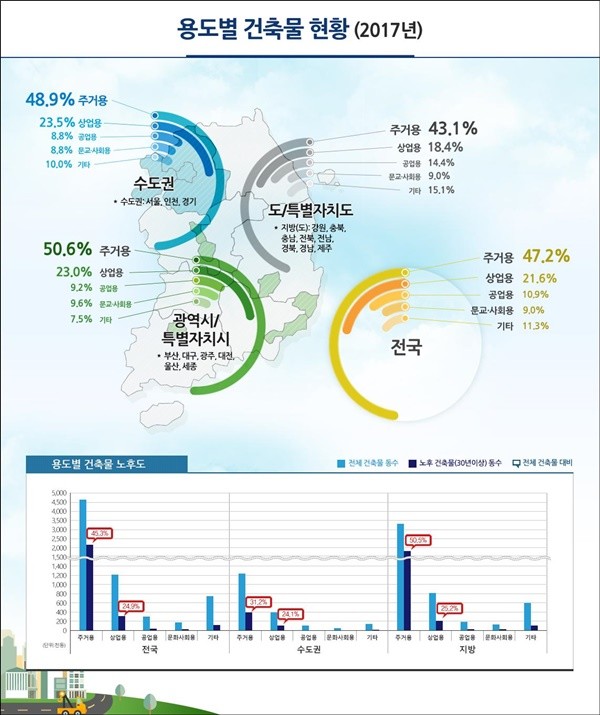 준공 후 30년 이상된 노후 건축물은 전국 260만1270동으로 전체(712만6526동)의 36.5%를 차지했다.