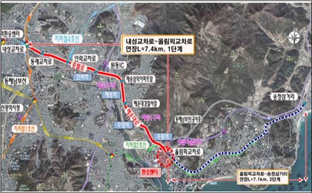 총 사업비 450억원이 투입되는 부산 내성~송정BRT(14.5km)는 전체 노선 중 1단계(내성교차로~올림픽교차로간 7,4km) 구간이 지난해 12월 개통했다. 2단계(올림픽교차로~송정교차로 7.1km) 구간은 오는 한비 개통을 목표로 공사가 진행중 이다.