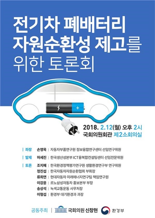 이번 토론회에는 조지혜 한국환경정책평가연구원 자원순환연구실장, 정진섭 한국자동차자원순환협회 부회장, 류희연 현대자동차 미래에너지연구팀 책임연구원, 이강윤 르노삼성자동차 홍보본부 부장, 송상석 녹색교통운동 사무처장, 이형섭 환경부 대기환경과장 등 민·관 전문가들이 전기차 폐배터리 자원순환 방안에 대해 토론을 펼친다.