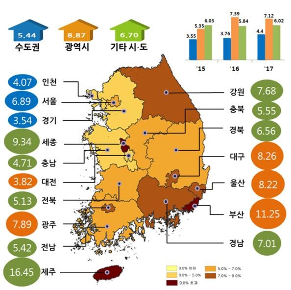 또 경기(3.54%)는 가장 낮은 상승률을 보였다. 대전(3.82%), 인천(4.07%), 충남(4.7%), 전북(5.13%) 등도 전국 평균 보다 낮은 상승률을 기록했다.