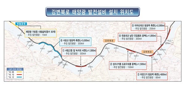 태양광 설비가 설치되는 곳은 강변북로 ▲도로시설물 6곳 9.8km(아차산대교, 서호교, 자양고가차도, 서빙고동 앞 사면, 성수2가동 옹벽, 천호대교 진입램프 옹벽) ▲가로등주 1곳 17km(마포구 하늘공원앞 등)이다.