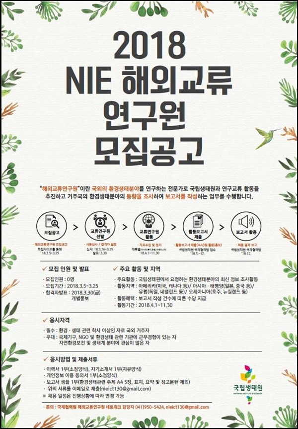 국립생태원은 이달 5일부터 25일까지 국제적인 종합생태 전문연구기관 기반 구축을 위해 ‘2018년도 환경생태분야 해외교류연구원’을 모집한다고 밝혔다.
