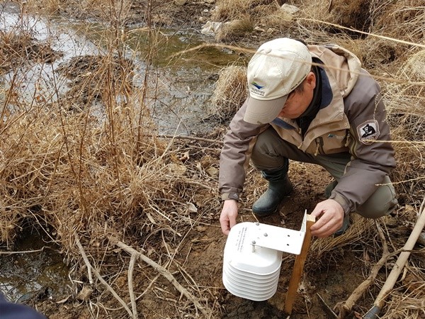 공단 연구진은 기후변화 추이를 연구하기 위해 2010년부터 9년간 구룡계곡 일대에서 북방산개구리의 첫 산란 시기를 기록하고 있다.