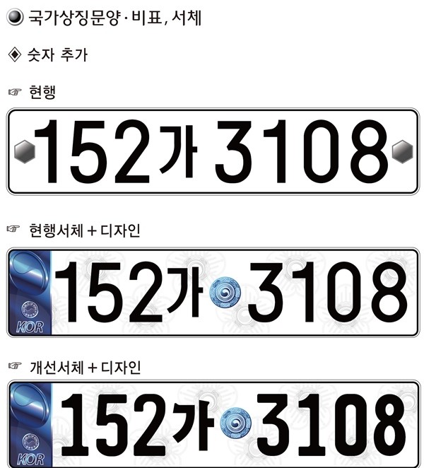 또 번호판 디자인에 국가 상징(태극) 문양과 비표를 추가하는 방식과 판독력을 높이기 위해 현재 번호판 서체의 굵기, 간격, 각도 등을 바꾸는 방식이다.
