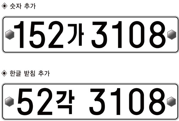 승용차 등록번호 체계 개편안에 따르면 숫자를 현재 앞자리 2자리에서 3자리로 번호를 추가하거나 한글 받침을 추가해 넣는 방식이다.