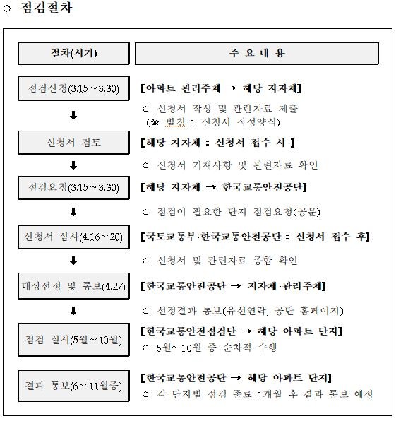 한국교통안전공단에서 신청한 단지를 대상으로 단지 환경, 개선 시급성 및 개선 의지 등을 평가한 후 4월 중에 점검 대상 단지를 선정한다.
