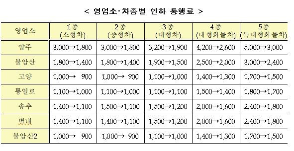 이에 따라 북부 구간 본선 최장거리인 일산∼퇴계원 구간 통행 시 승용차(1종)의 경우 4800원에서 3200원으로 1600원(33%) 인하된다. 대형화물차(4종)의 경우 6700원에서 4600원으로 2100원(31%) 인하되며, 최장 거리 외에 나머지 구간도 재정도로 대비 최대 1.9배(양주영업소)에서 1.1배 이하 수준으로 인하된다.