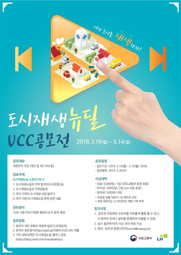 국토교통부와 LH는 도시재생뉴딜 정책에 대한 국민의 관심 및 참여 유도를 위한 영상 공모전 ‘너의 도시를 재생하라!’를 개최한다고 19일 밝혔다.