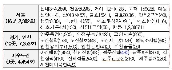 이번에 공고한 지구는 신내3-4지구·천왕8지구 등 서울 16곳(2382가구)과 양주옥정·오산세교2 등 경기·인천 10곳(7353가구), 아산·광주·김천 등 비수도권 9곳(4454가구)이다.